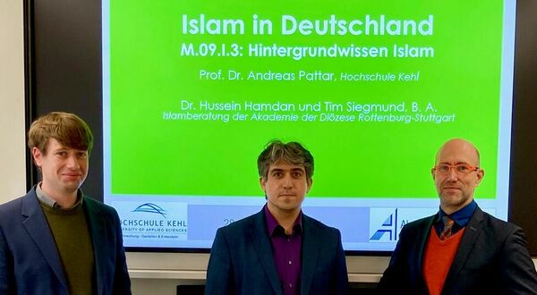 Gemeinsam mit Prof. Dr. Andreas Pattar von der Hochschule Kehl informierten Dr. Hussein Hamdan, Leiter des Fachbereichs Muslime in Deutschland, und Tim Florian Siegmund, wissenschaftlicher Assistent am Fachbereich, über Grundlagen des Islam, seine Strukturen in Deutschland sowie kommunale Handlungsmöglichkeiten bei diesem Thema. In Gruppenarbeiten beschäftigten sich die Studierenden mit den zahlreichen islamischen Gruppen in Deutschland und erarbeiteten Lösungen für verschiedene Fallbeispiele, mit denen die Islamberatung immer wieder zu tun hat.