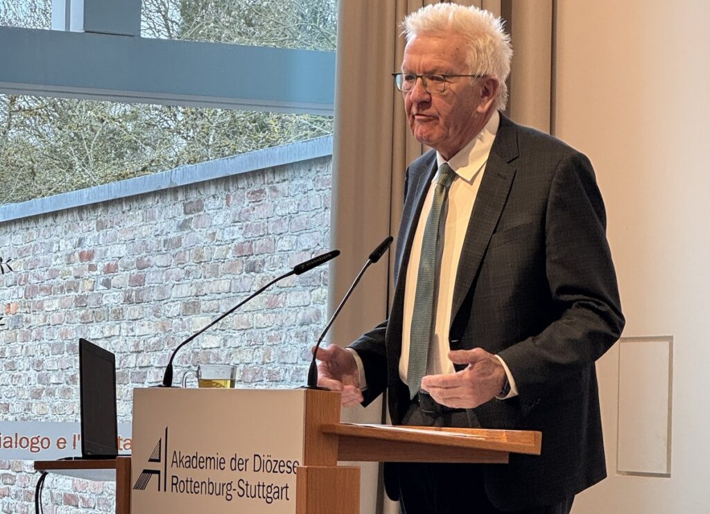 „Auch eine säkulare Gesellschaft, ja gerade die säkulare Gesellschaft braucht das, was uns nur die Religion geben kann“, so Kretschmann am Vormittag in der Akademie. Dazu zähle eine grundlegende „Lese- und Deutungsfähigkeit unserer Kultur“, aber auch das Erzählen „von der Verantwortung für die Welt, für die Menschen, für die Zukunft, von Nächsten- und Feindesliebe, also von Empathie und Respekt, von Umkehr und Vergebung, also von Neuanfang und Toleranz“.