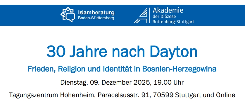 Frieden, Religion und Identität in Bosnien-Herzegowina Dienstag, 09. Dezember 2025, 19.00 Uhr Tagungszentrum Hohenheim, Paracelsusstr. 91, 70599 Stuttgart und Online Drei Jahrzehnte nach dem Dayton-Abkommen…